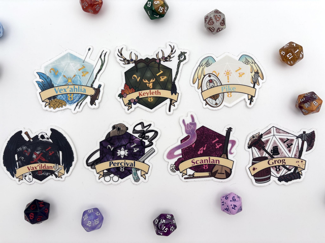Sticker inspired by the adventurers from Vox Machina, gathering a d20 design and symbols of each character. An awesome customized sticker for TTRPG lovers.