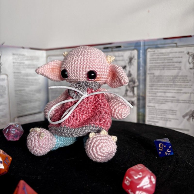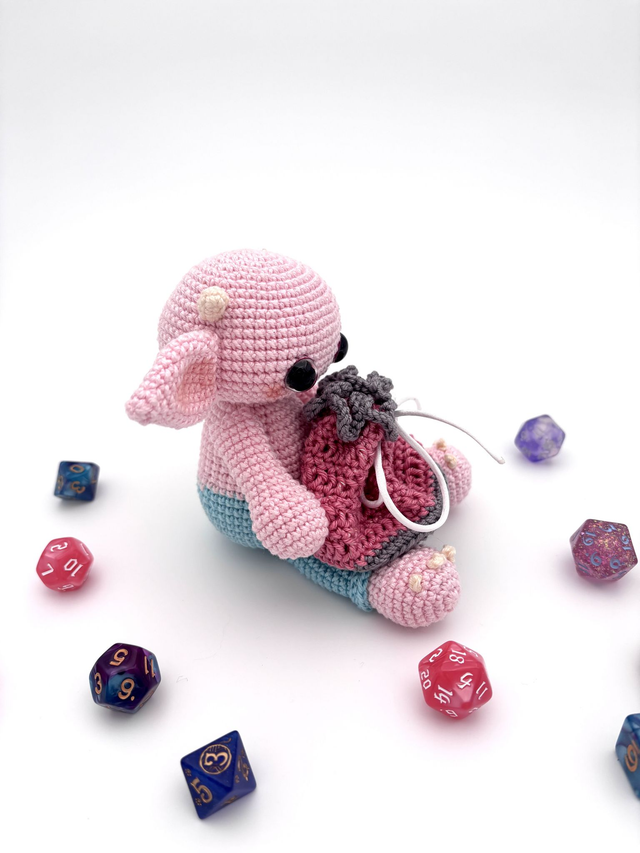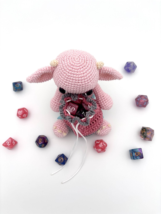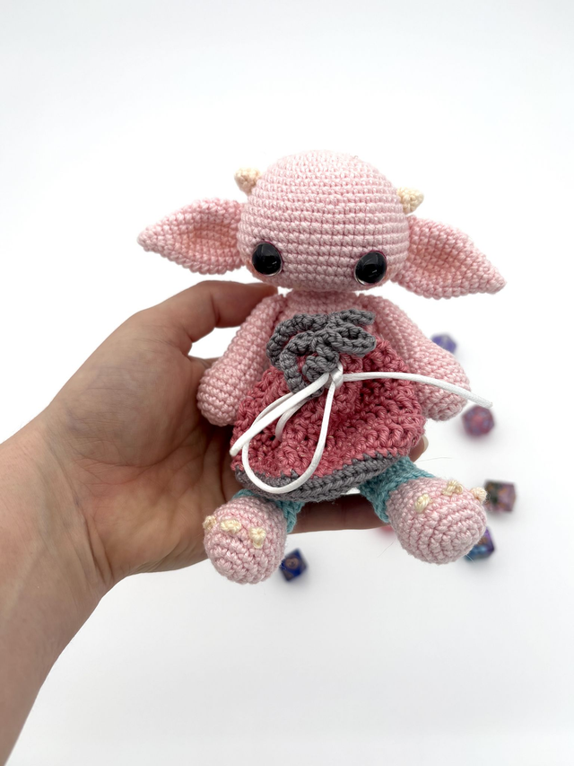 Enhance your gaming experience with this unique dice keeper in the shape of a goblin! Perfect for role-playing game enthusiasts like Dungeons & Dragons players, this crochet plush is both a practical accessory and an adorable companion. Handmade from soft, durable cotton, the goblin bag can hold a complete set of dice (7 pieces), ideal for keeping your precious dice close at hand during your sessions.