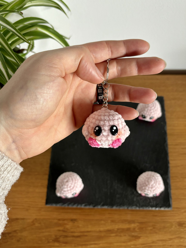 - Made with chenille yarn, safety eyes, polyfill and a keyring