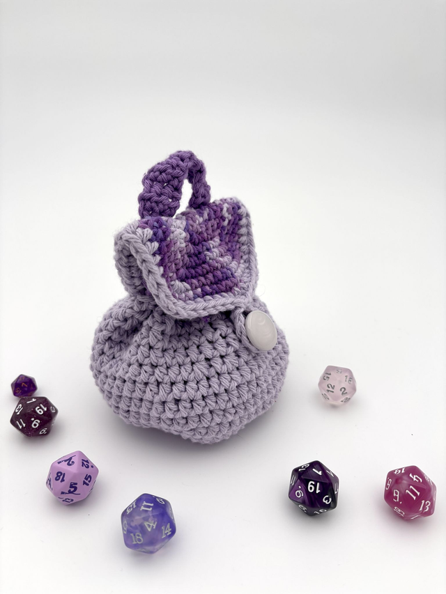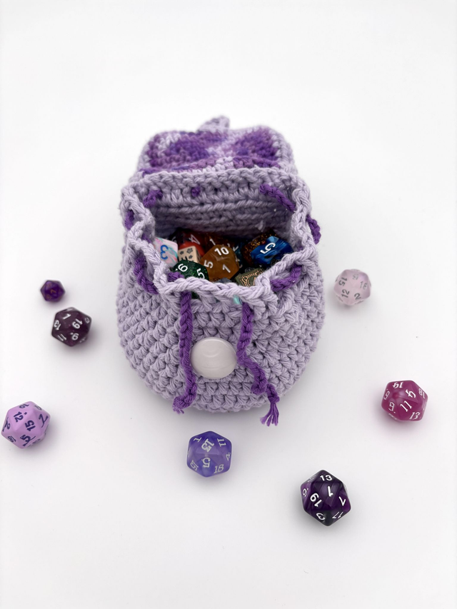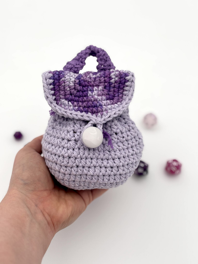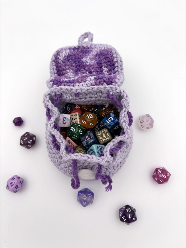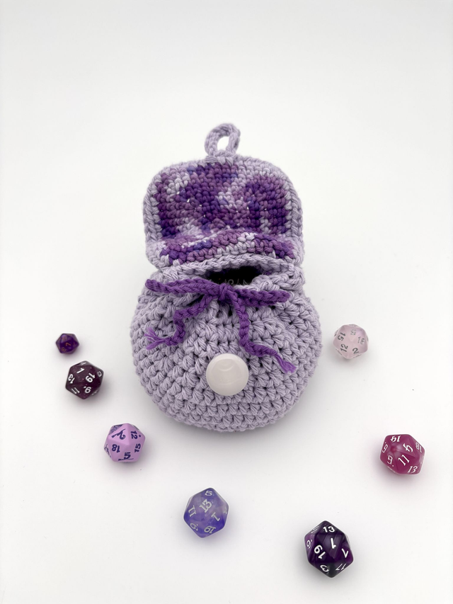 This adorable crochet backpack is more than just cute—it's functional! Designed as a miniature drawstring bag, it’s perfect for holding your dice, tokens or small treasures, while looking just like a tiny adventurer’s backpack.