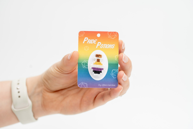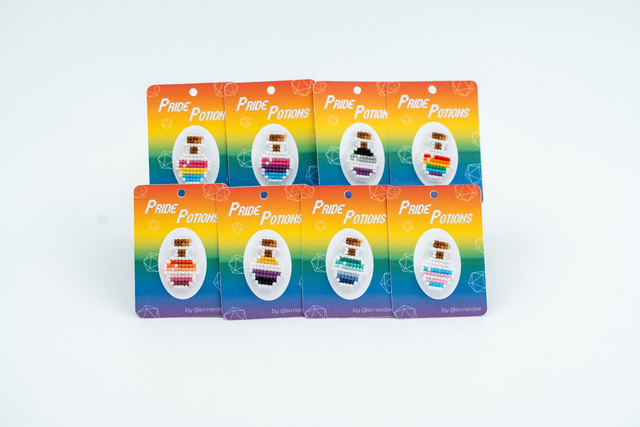 Celebrate who you are with a touch of magic! These cross-stitched potion pins are lovingly handmade and represent a variety of LGBTQIA+ pride flags. Each tiny potion bottle is a symbol of identity, joy and self-expression—stitched with pride.