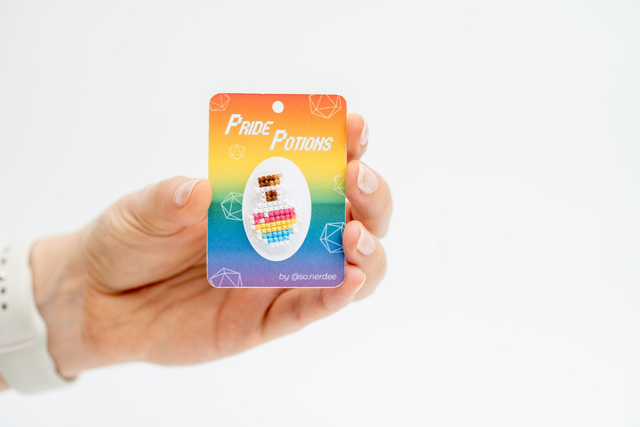 Celebrate who you are with a touch of magic! These cross-stitched potion pins are lovingly handmade and represent a variety of LGBTQIA+ pride flags. Each tiny potion bottle is a symbol of identity, joy and self-expression—stitched with pride.