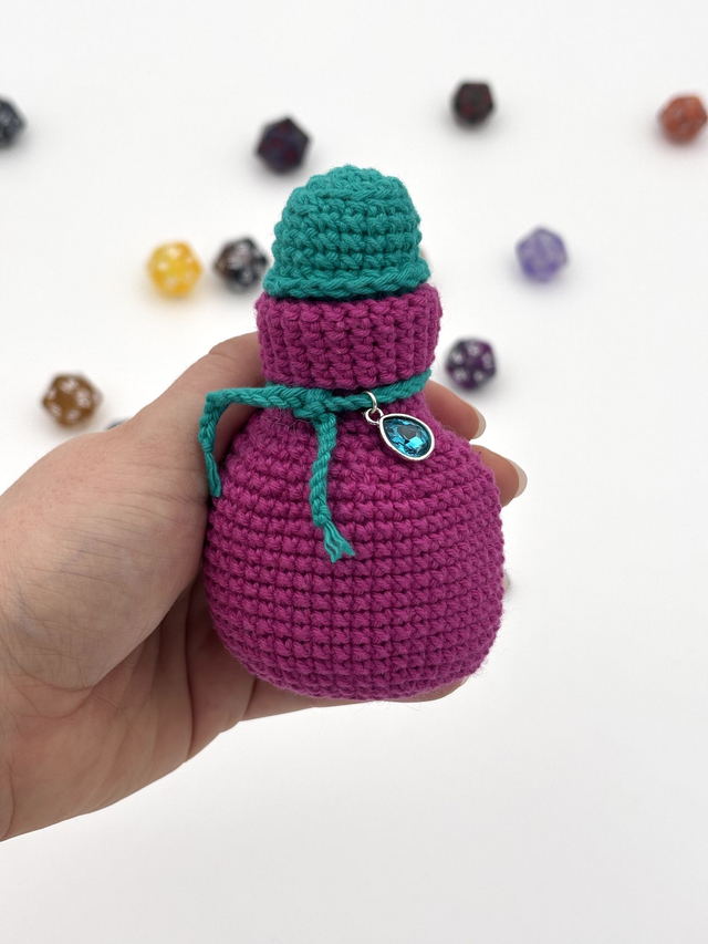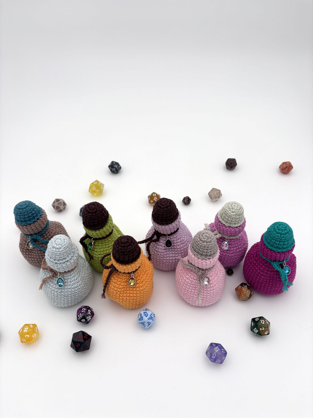Add a touch of magic to your game table with these crochet potion dice bags, perfect for role-playing enthusiasts!