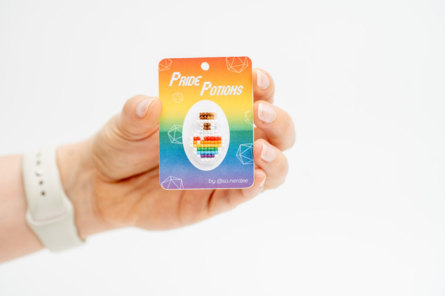 Celebrate who you are with a touch of magic! These cross-stitched potion pins are lovingly handmade and represent a variety of LGBTQIA+ pride flags. Each tiny potion bottle is a symbol of identity, joy and self-expression—stitched with pride.